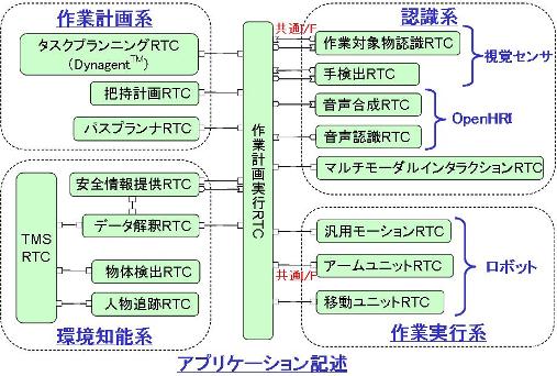 菓子類)の搬送を行う施設内生活支援ロボットに必要なRTコンポーネント(三次元ビジョン、音声認識、作業計画、把持計画、環境構造化、アームユニット、移動体ユニット等)を分担して研究・開発し、これらのコンポーネントを双腕移動型ロボット(SmartPal V)に搭載し、RTミドルウェアにより接続されることにより、以下のような作業が遂行できることを検証致しました。