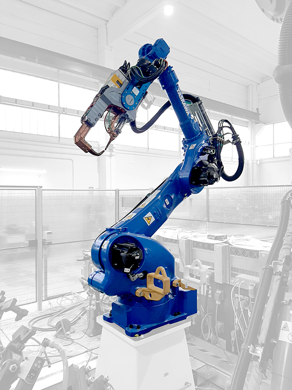 大電流を流す板と板の隙間を無くすために非常に大きな電極で挟む必要がでてくるため、スポットガンは大きく重くなります。このため比較的大型で可搬質量が100キロ~200キロ程度のロボットが用いられています。